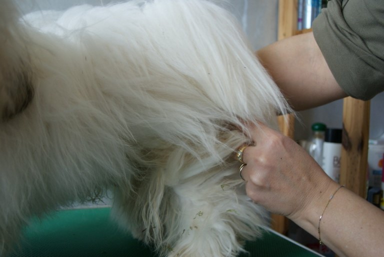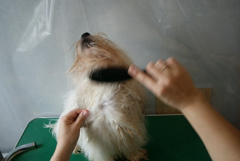 - Poser le chien sur une table bien stable, une serviette absorbante sur le corps.