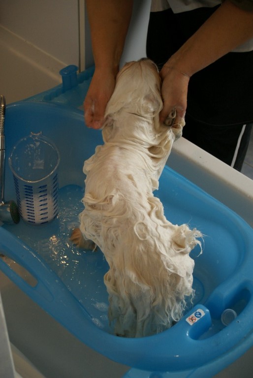 - Recommencer l'opération une seconde fois avec un shampooing pour poils blancs si nécessaire. Rincer abondamment.