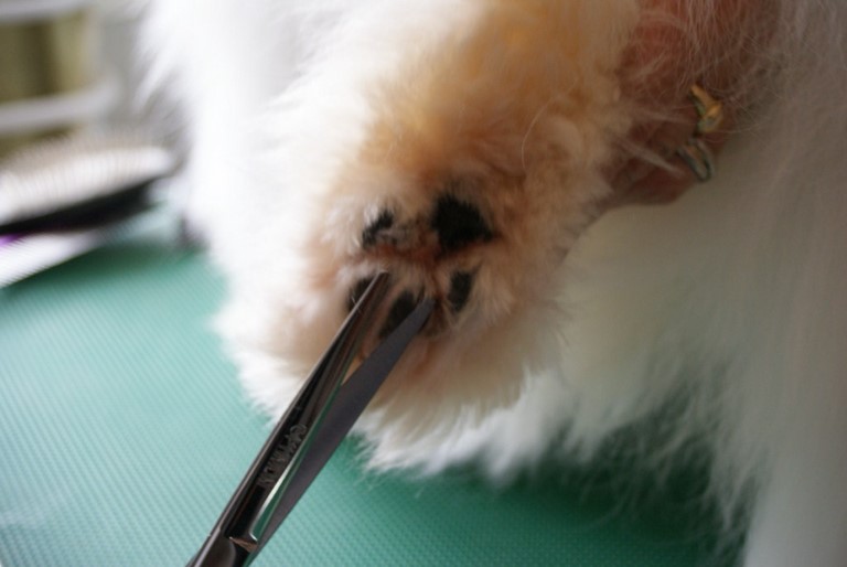 Avec des ciseaux à bouts ronds, dégager les poils entre les coussinets et arrondir les bouts des pieds.