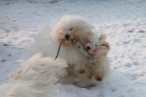 Il n'y a pas à dire, nos Cotons sont vraiment de joyeux compères qui n'hésitent pas une seconde à s'en donner à coeur joie dans la neige. Les uns s'organisent des courses-poursuites, les autres se disputent les jouets, bref, tout le monde y trouve son compte !!!