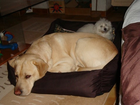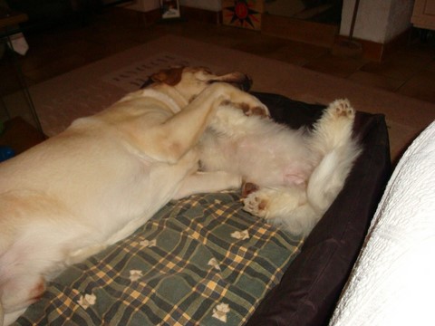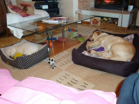Grass'Mat' tient compagnie à Lucette et Jean tandis que Gila joue le trublion auprès de Nadine et Dickens le Labrador ( Gila et lui sont inséparables comme en témoignent ces photos insoutenables !!! ) . Les qualités d'adaptation de nos Cotons sont à la hauteur de nos espérances et pour leurs maîtres ce n'est que du bonheur !!!
