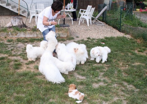 A six semaines passées, les chiots sortent tous les jours au jardin pour explorer et surtout jouer. Les adultes veillent sur eux bien gentiment avec beaucoup de patience...;-)