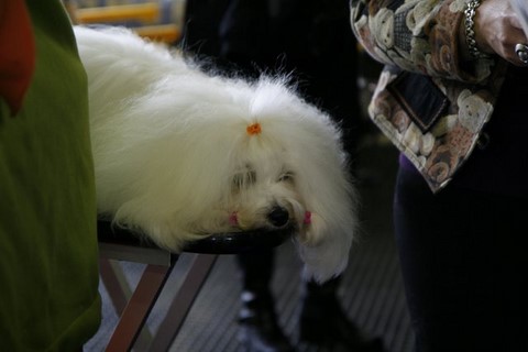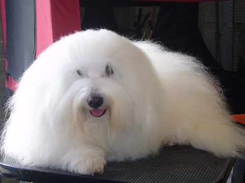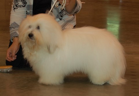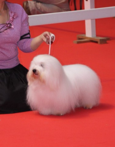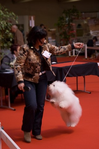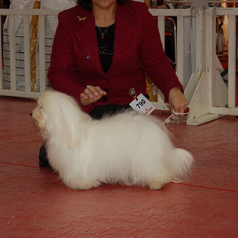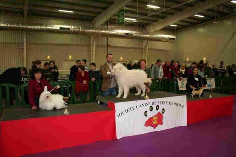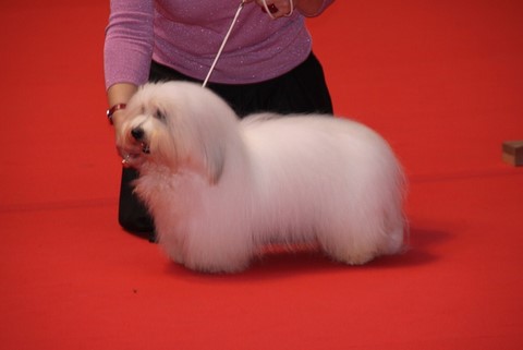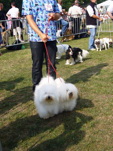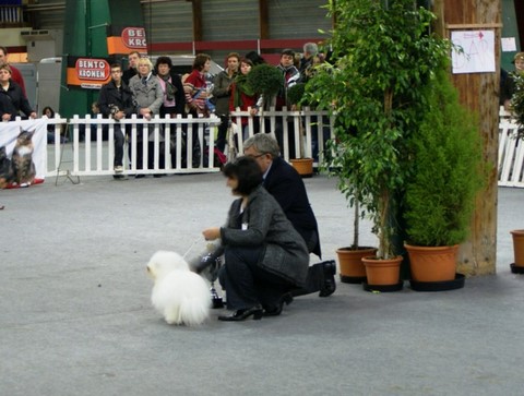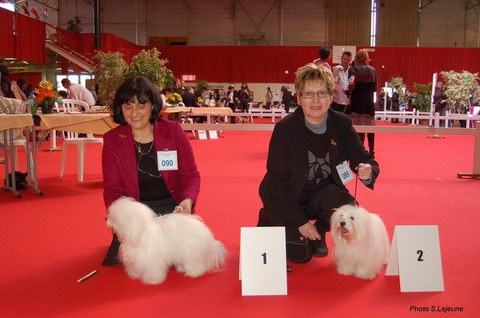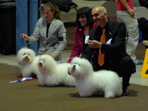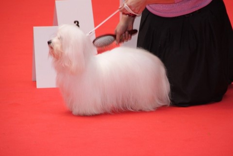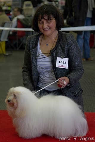 69 Cotons engagés, quelques absents, une grande hétérogénéité des chiens participants, un examen plus que sommaire des morphologies sur la table des jugements, un festival off de commentaires et de supputations divers et sans aucun intérêt pour l'amélioration de cette race pourtant si douce et enjoleuse, voilà en quelques mots le souvenir qu'il nous reste de cette interminable journée (et oui, nous avons poireauté jusqu'au soir pour la fameuse photo officielle de nos chers trésors tandis que s'éteignaient lumières et micros du Best in Show et non, nous n' avons pas raté celui-ci exprès !!!).